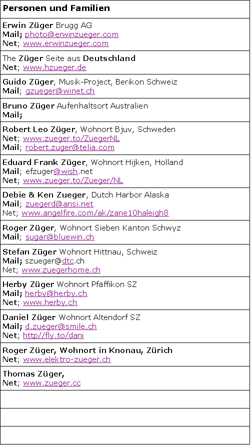 Unten sind einige Email- und Internetadressen von Bekannten, Verwandten und Freunden der Zügerfamilie, sowie nützlichen Adressen über Familienforschung im Internet. |