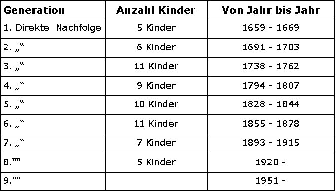 Aufgrund ausgedehnten Nachforschungen konnte folgende Ahnentafel erstellt werden. Das Geschlecht kann bis in das Jahr 1305 nachgewiesen werden. Die eigentliche Registrierung erfolgte in den Kirchenbücher so ca. ab 1600. Erst später erfolgten die Aufzeichnungen in den Gemeinden. Die Nachforschungen ergaben, dass wir aus dem Stamme Samson Züger, im Jahr 1646 verheiratet mit Maria Boss, sind. In dessen Nachfolge leben wir heute, gegen Ende des 19th Jahrhundert, in der 9. Generation. Über die Generationen hinweg wuchs die Nachfolge heran. |